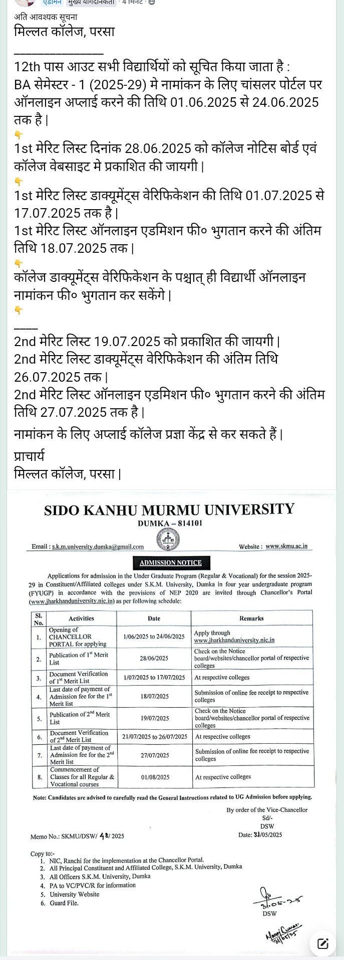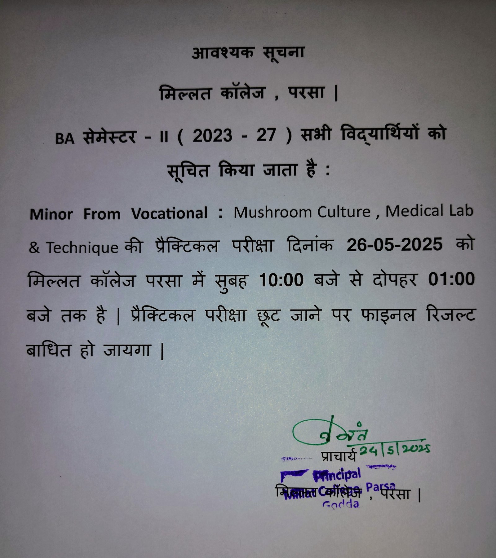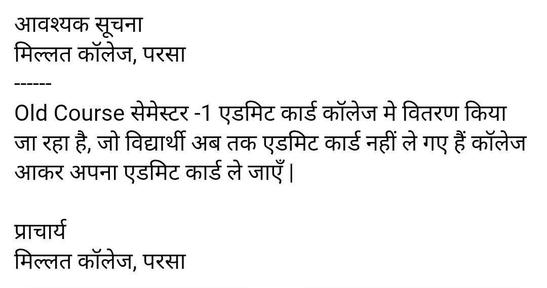 16 January 2020 Download Attached Fileमिल्लत कॉलेज परसा B.A के सभी छात्र/छात्राओं के लिए। (नीचे दिए गए download लिंक पर click करें।)
